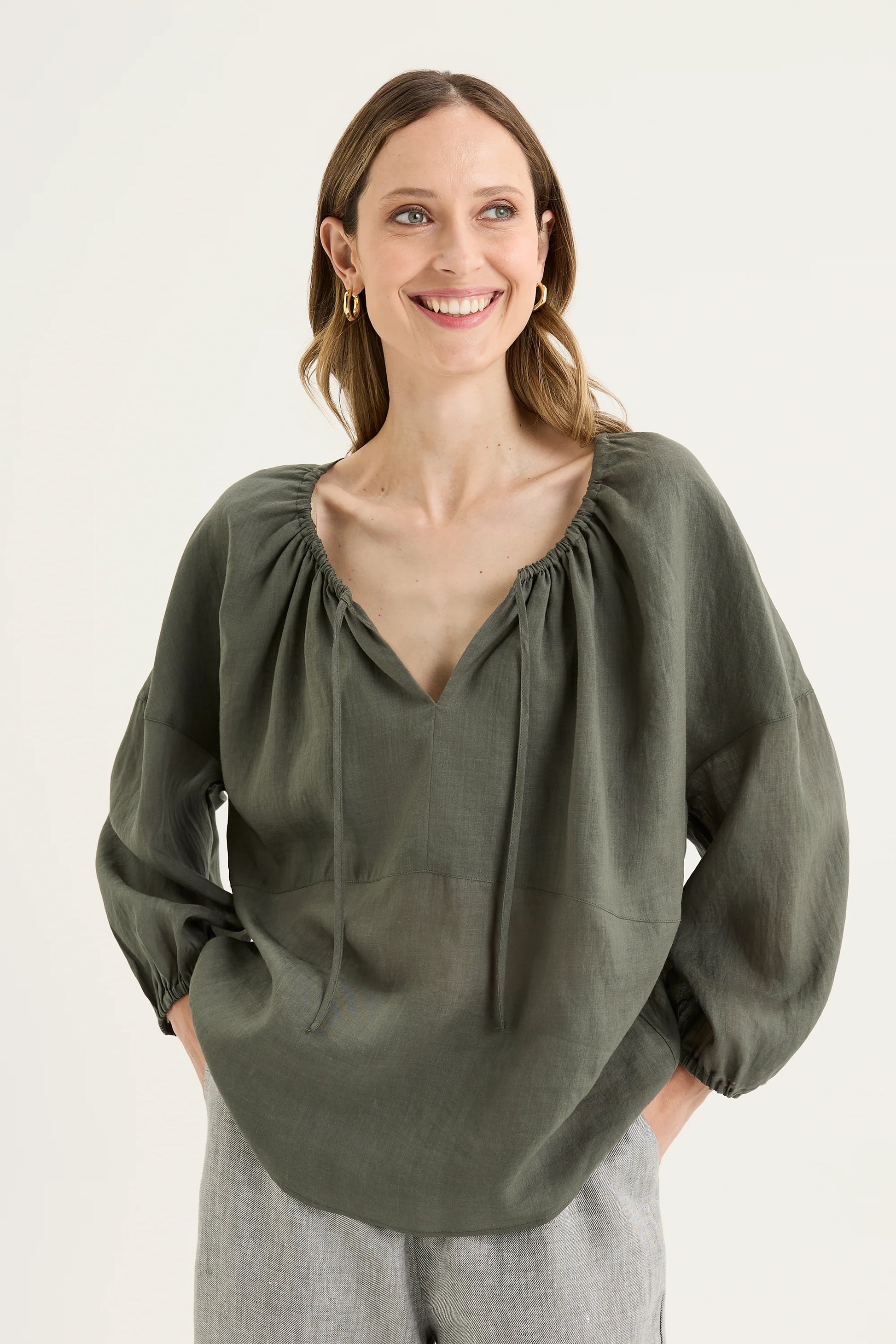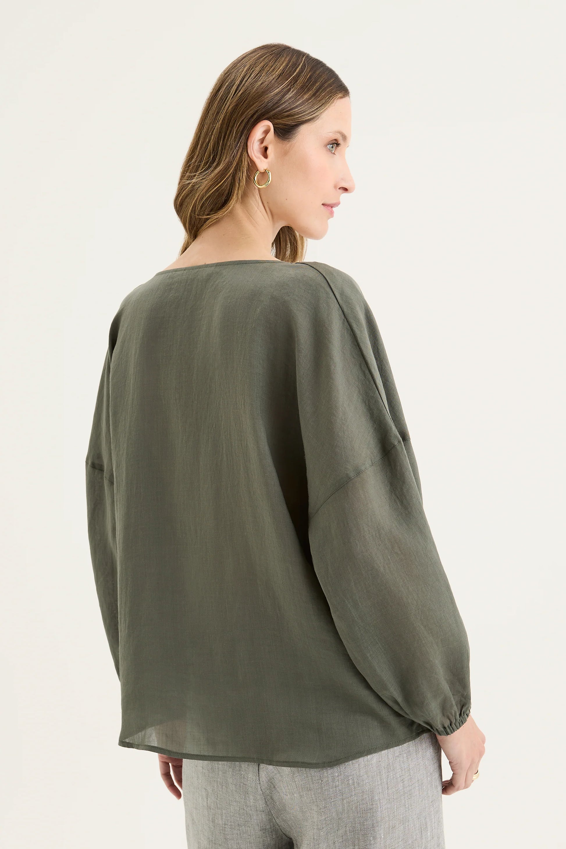 Crafted from a lustrous ramie-tencel blend, it drapes beautifully and moves with ease, offering a lightweight linen-like texture. The cut-away round neckline can be styled two ways - worn open for a relaxed V-neck effect, or drawn in with the encased drawstring for a softly gathered, rounded shape. Featuring a double-layered front yoke for structure, drop-shoulder sleeves with elastic cuffs for volume, and a high-low hem to enhance the flattering silhouette, it’s a versatile piece that is equally suited to casual days or elevated layering.