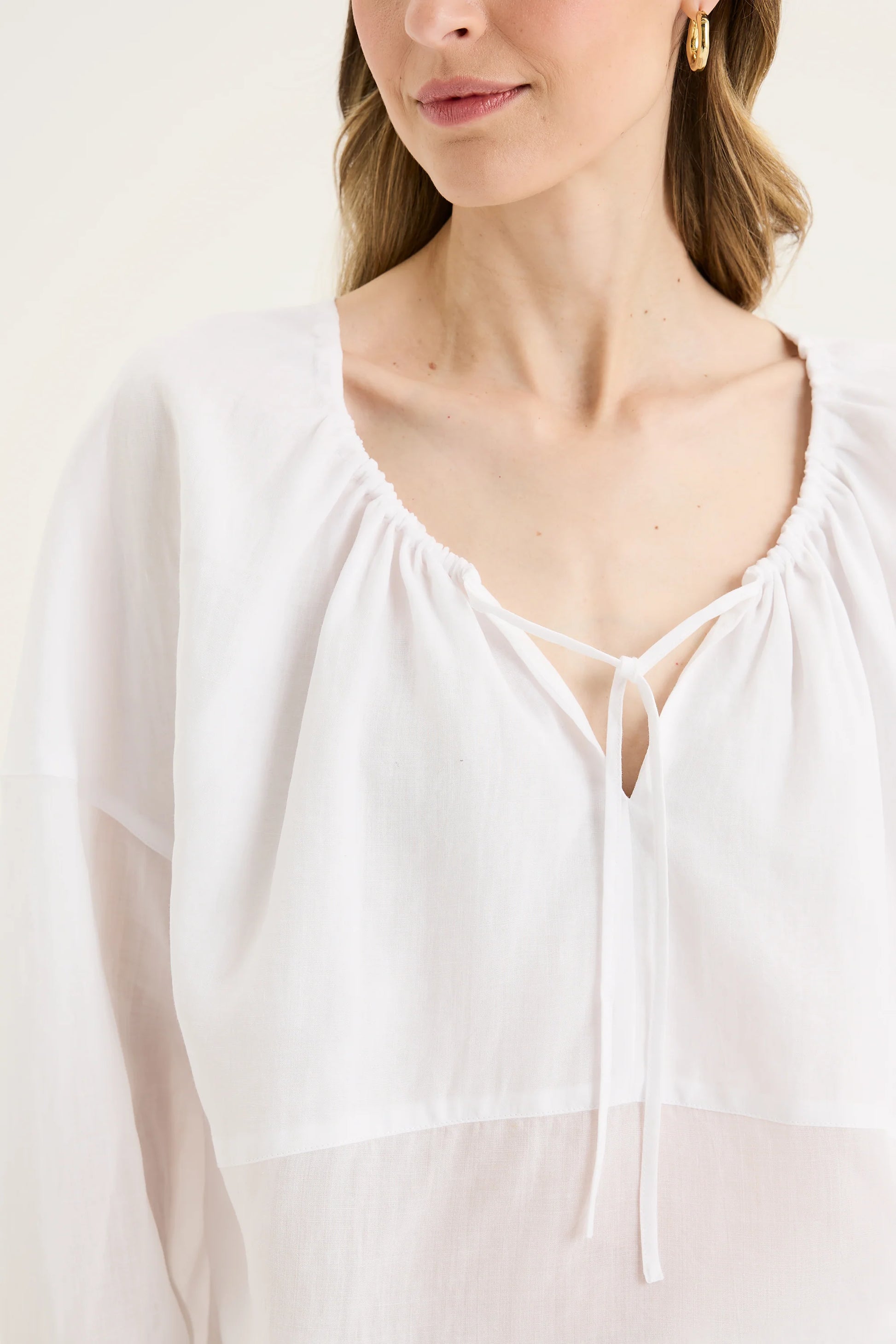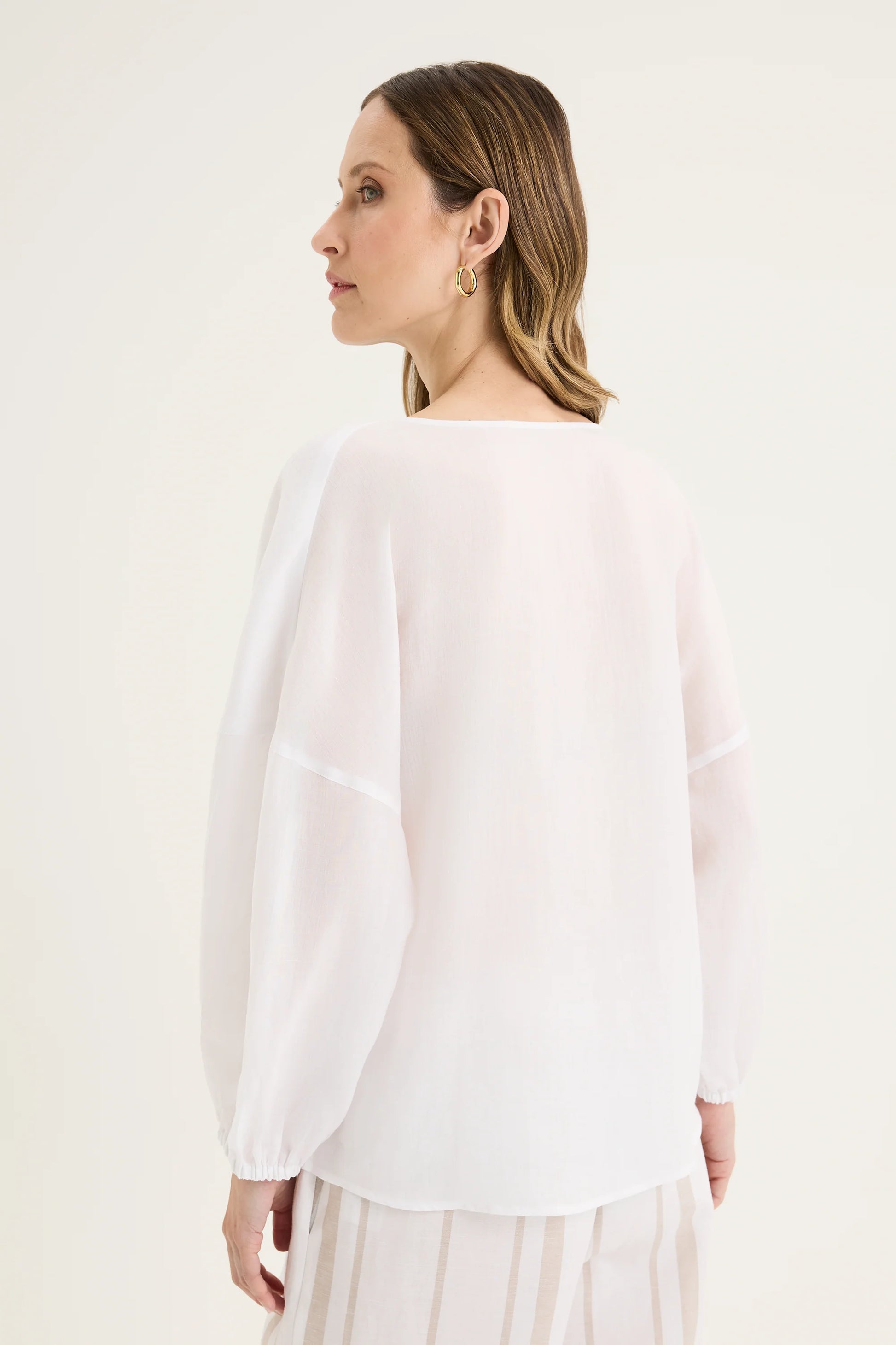 Crafted from a lustrous ramie-tencel blend, it drapes beautifully and moves with ease, offering a lightweight linen-like texture. The cut-away round neckline can be styled two ways - worn open for a relaxed V-neck effect, or drawn in with the encased drawstring for a softly gathered, rounded shape. Featuring a double-layered front yoke for structure, drop-shoulder sleeves with elastic cuffs for volume, and a high-low hem to enhance the flattering silhouette, it’s a versatile piece that is equally suited to casual days or elevated layering.