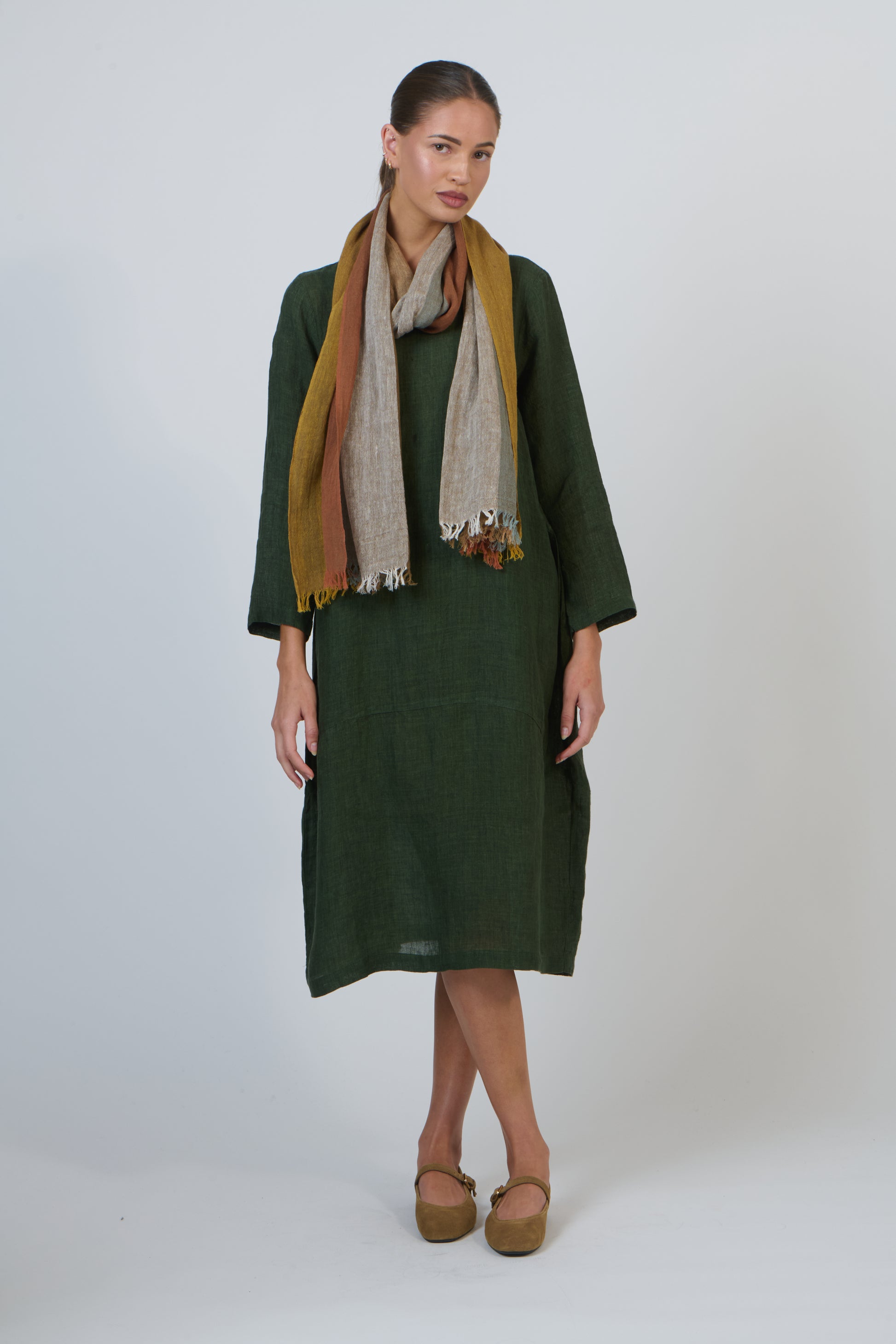 Grounded in warm, natural tones, LN26-8 brings subtle colour and texture to everyday dressing. Crafted from 100% linen, this lightweight scarf features an earthy colour block design with a soft drape and knotted fringe for an artisanal finish. Breathable and naturally temperature-regulating, it feels as good as it looks. Ideal for elevating neutral outfits, transitional weather, and effortless everyday layering.