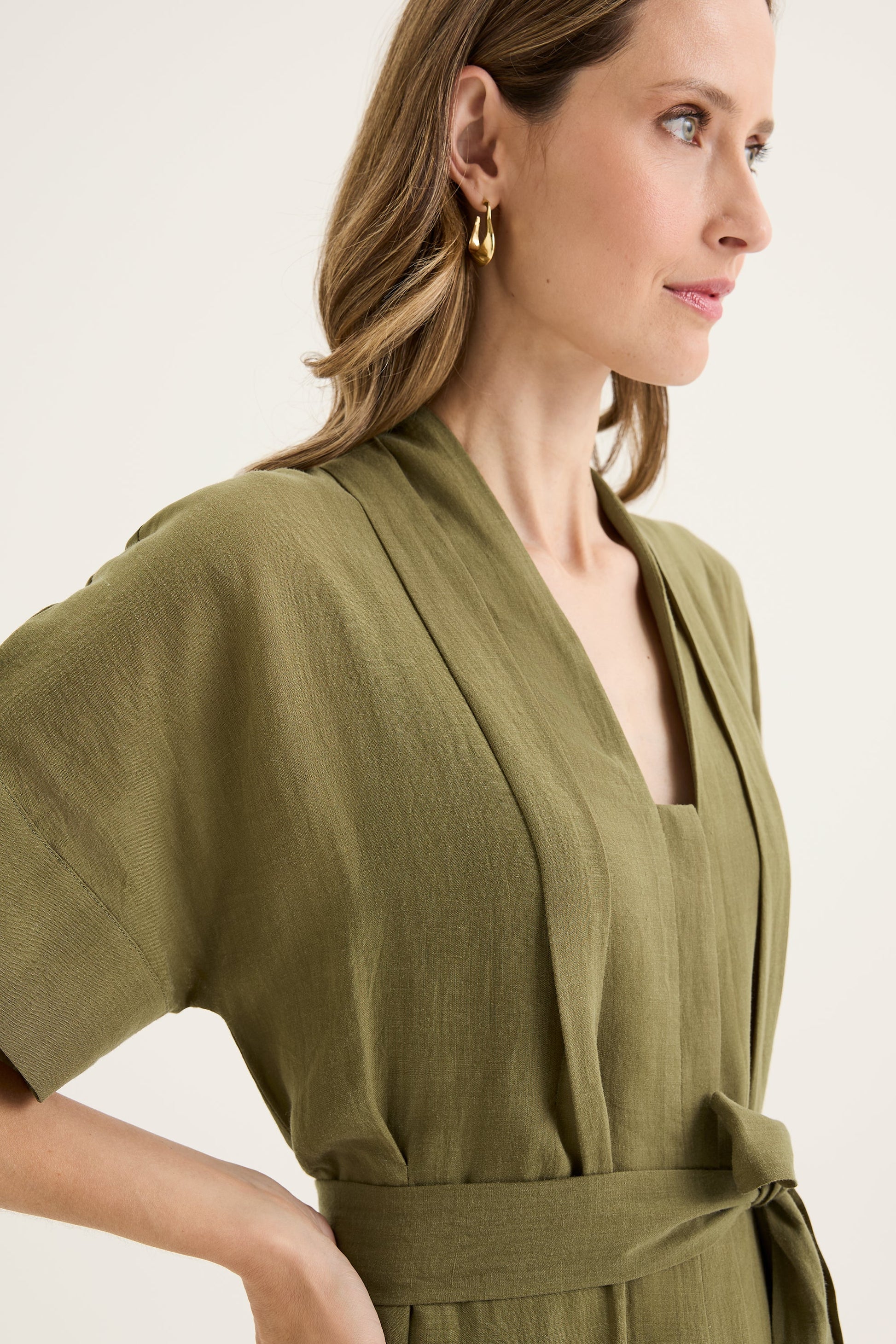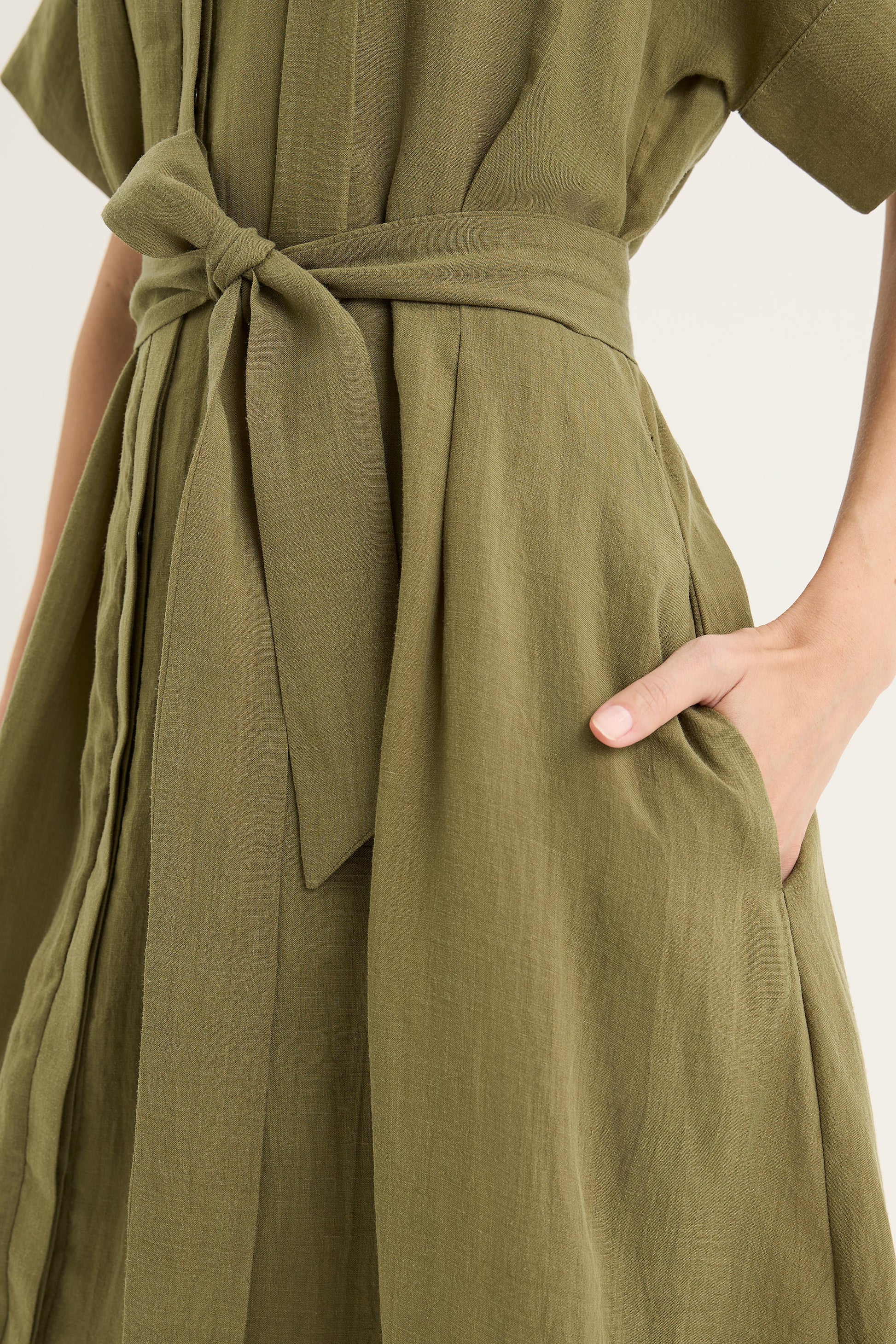 The Mateus Dress offers a considered balance of structure and ease, making it a true investment piece for this year's summer season and beyond. Crafted with a flattering V neckline, it’s defined by artfully placed front tucks that shape the silhouette while maintaining a fluid drape. The extended short sleeves and concealed button closure at the front add clean, understated detail, while the matching green waist tie allows the fit to be worn cinched or relaxed. Lined through the body for comfort and opacity, it also features functional inseam pockets for practicality. Falling to a mid-calf midi length in a semi-fitted, softly flared cut, it’s a versatile dress that feels equally at home styled for work, occasions, or everyday outfit
