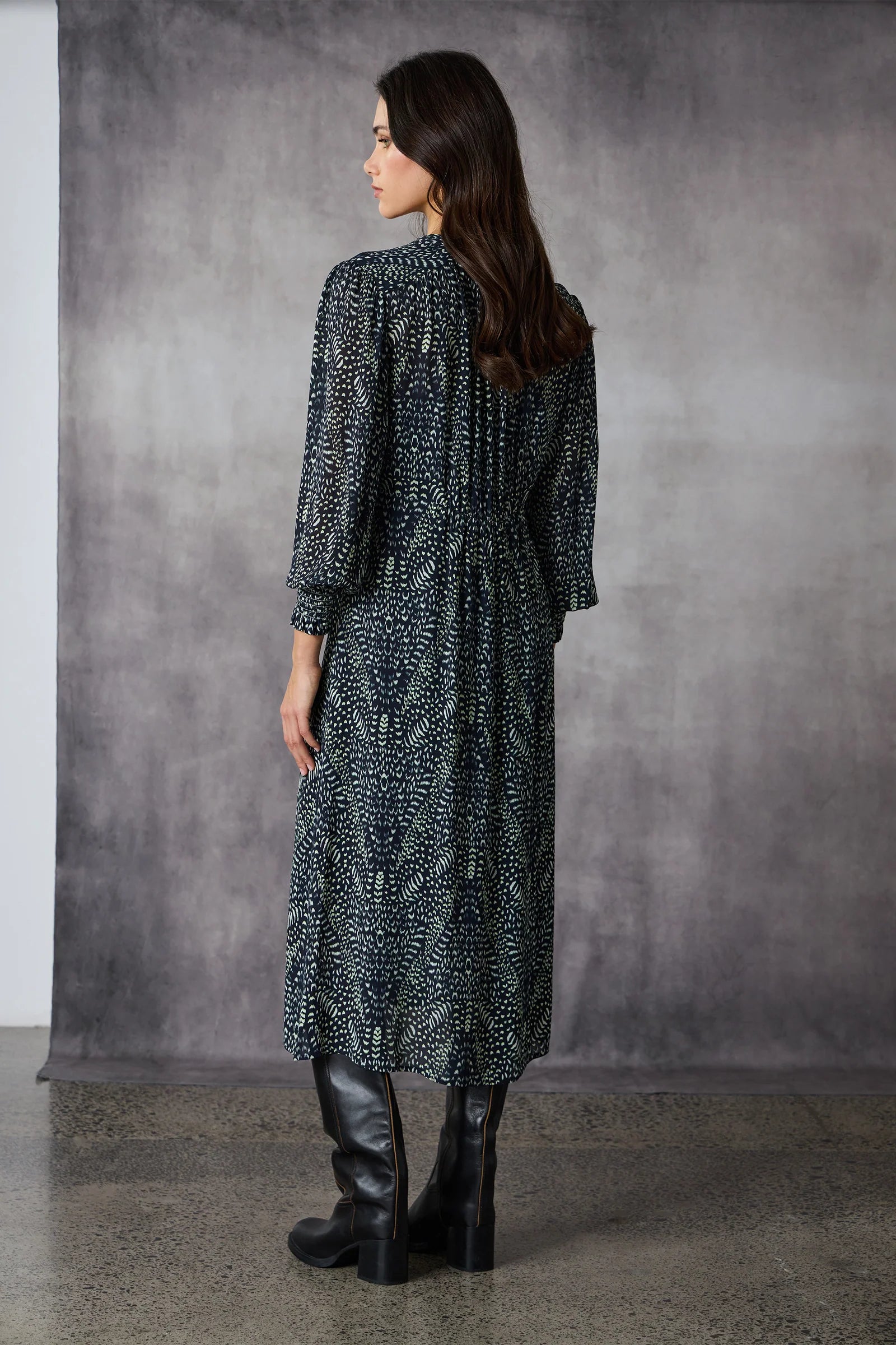 Embrace effortless elegance with the Santiago Dress, a midi-length silhoutte in the Santiago Animal Print on a georgette. Scallop edge embroidery adds charm to the centrefront placket, adorned with self covered buttons. Floaty sleeves are finished with deep shirred cuffs while the elasticated back waist provides a flattering fit and all-day comfort, making it a versatile and stylish choice.